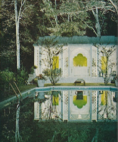 Yes, this was my weekend, so I needed to find some rays of sunshine somewhere. I think that I found it in these 1968 photos of the pool pavilion at Anne Cox Chambers' Atlanta estate. Designed by architect Henri Jova, the Regency and Chinese Chippendale hybrid was built to complement the main house, a Regency style home designed by Philip Shutze.