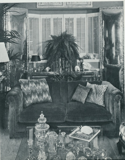 Crystal bibelots, displayed on the cocktail table, add some sparkle, as do those metal screens. Reg Adams, designer.