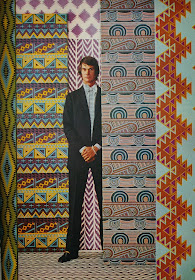 In 1971, McCarty raised his profile further- especially in America- thanks to both his first-prize win in the Burlington House Young Designer competition and his debut collection of fabrics and wallcoverings for Kirk-Brummel. Titled "Noble Savage", the collection, which you can see above- that's McCarty standing among his designs- was a modern riff on American Indian motifs. With names such as "Hopi", "Geronimo", "Shawnee", and "Seminole", the prints were McCarty's attempt to "give people another viewpoint into Indian designs. I think one's eye has been dazzled by the super-plastic pop art thing, which is a definite chore to live with. The idea here was a softer, more fluid look." Looking at these designs forty-plus years after their debut, I'm not really sure that I would call these prints soft and fluid. However, I suppose that if one compares them to the riotous patterns that were so popular in the late Sixties and early Seventies, one could say that McCarty's designs were not quite as harsh.