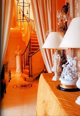 The entrance hall in a London mansion apartment. Haslam says that he got the idea to drape the stairwell in white fabric from Christian Dior's Paris home.