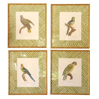 I was catching up on my 1st dibs browsing last night and came across these parrot prints from Chapman Radcliff (see above). Don't you like how the prints are mounted on the fabric covered mats? So clever! Of course there are certain types of prints that are best displayed in plain mats, but here the fabric adds a real flair.