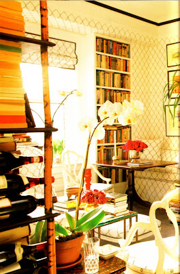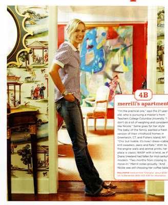 It is quite interesting to see the unique approaches the sisters took in designing their apartments (although there are more similarities than there are differences- after all, these are sisters). Nicole prefers a look of "frayed elegance" with a bit of edginess thrown in. She prefers more unusual color combinations like turquoise and brown. Merrill's apartment is more traditional and WASP-y with the Scalamandre "Shanghai" wallpaper in the entryway and a glossy red living room. Youthful touches in both apartments include lucite cube tables and chairs, Barcelona chairs, and modern artwork, but this is where the edginess ends. To me, both of these apartments possess the traditional look with which they were raised but are tailored to the lifestyle of young modern sisters.