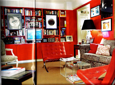 In my opinion, Keith Irvine is a genius with the color red. Those glossy red walls look fantastic against the classic brown and white zebra print. Merrill's living room is also symmetrically arranged and is "tighter" than the living room of her sister.