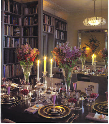 A tablesetting in shades of purple looks smart against a grisaille background (image from Perfect Tables by William Yeoward)