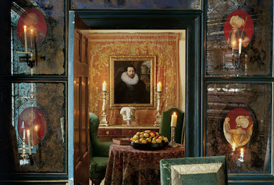 I've long admired British designer Alidad's interiors. They're luxurious, opulent, and rather grand. You almost feel like you've stepped back in time- a Russian tsarina or a French nobleman might feel quite at home in these rooms. What strikes me most, though, is his treatment of a room's walls. Not one to be content with a little paint or some simple paper, Alidad adorns walls with stamped leather, bespoke wallpaper, and verre églomisé panels. The effect is one that is enchanting and hypnotizing.