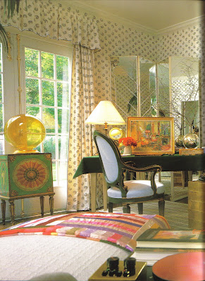 And no, it's not the spatter pattern that is discussed so frequently in episodes of "CSI". It's "Spatter", and it's one of my favorite Hinson prints. Designed by Harry Hinson in 1974, the print was inspired by the spatter motif found often in Colonial ceramicware (this according to a 2001 New York Times article). The article also mentioned that it's a print that counts Albert Hadley and Jeffrey Bilhuber amongst its fans. I've also read that Billy Baldwin used it in his Nantucket home, but I can't find a photo.