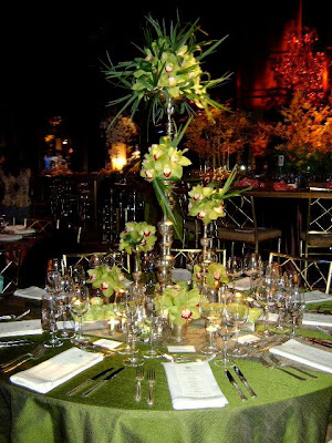 I love how Malcolm chose to work with green Cymbidium orchids, green tea roses, and liriope leaves. Yes it's simple, but so striking too. The other thing that I admire about the table are the layers. You've got elements of varying heights, discreet details (the beautifully engraved placecards), and reflective surfaces. It's the type of table that you can't absorb immediately- you have to sit there and let it soak in. This is certainly a hallmark of Malcolm's work; he prefers the subtle. And isn't that appropriate right now?