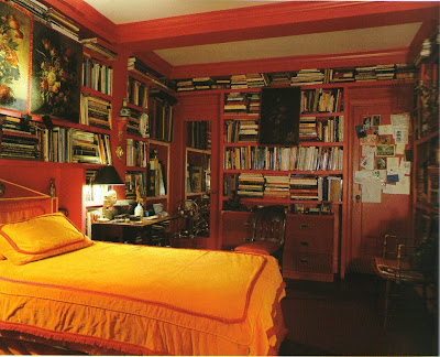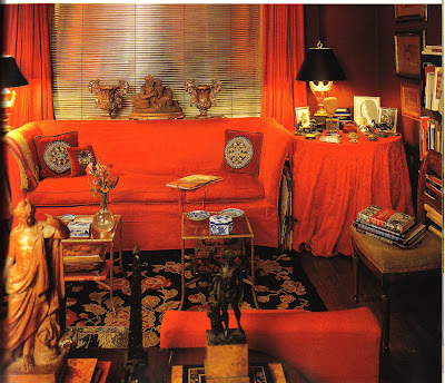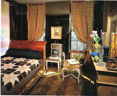 Though the flat, located in Chelsea, is really quite small, it's loaded with style. What makes this space so alluring to me is the fact that the apartment is richly colored and richly appointed. Though I was not such a fan of green, Richard's living room made me a convert. How can you not find pea-green colored silk beautiful when it's used on walls, sofas, and lamp shades? And how gorgeous is that red bedroom? I think red is a difficult color for bedrooms, but it works here- so decadent!