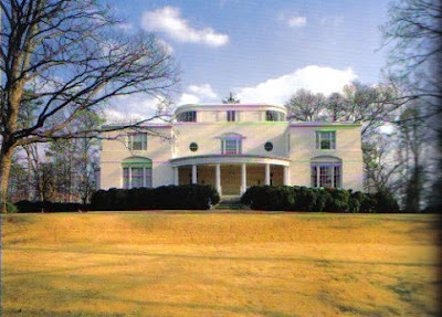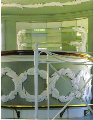 The English Regency house, located in Atlanta and designed in 1936 by Philip Shutze, is rather unusual thanks to that modern, streamlined penthouse, something that would have been in vogue at that time. Actually, I would say that it's still in vogue today. Shutze designed the penthouse in response to the clients' desire for an observation area, obliging them with corner walls filled with windows and roof terraces. But for me it's what's on the inside that excites me...the curving bar that looks as though it's on a ship's helm. There's a Serge Roche feel to the space what with that plaster detail on the ceiling, those shelf supports, and the ornamentation on the bar itself. And the railing around the bar area and the staircase completes the chic look.