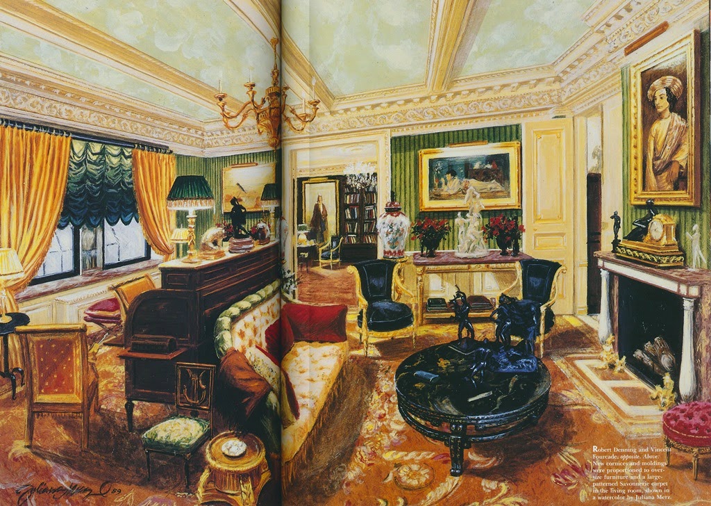 That being said, I really do appreciate their body of work, and when I come across photos of a Denning and Fourcade-decorated home, I always stop to look. You can't glance at their work and expect to absorb it quickly. The layers and layers of, well, stuff require close examination. Only then can one see the method that went into their multi-layered approach to decorating. I don't get the impression that they simply threw a lot of furnishings into a room without any forethought.