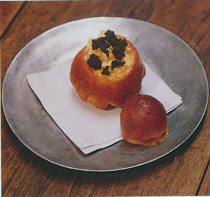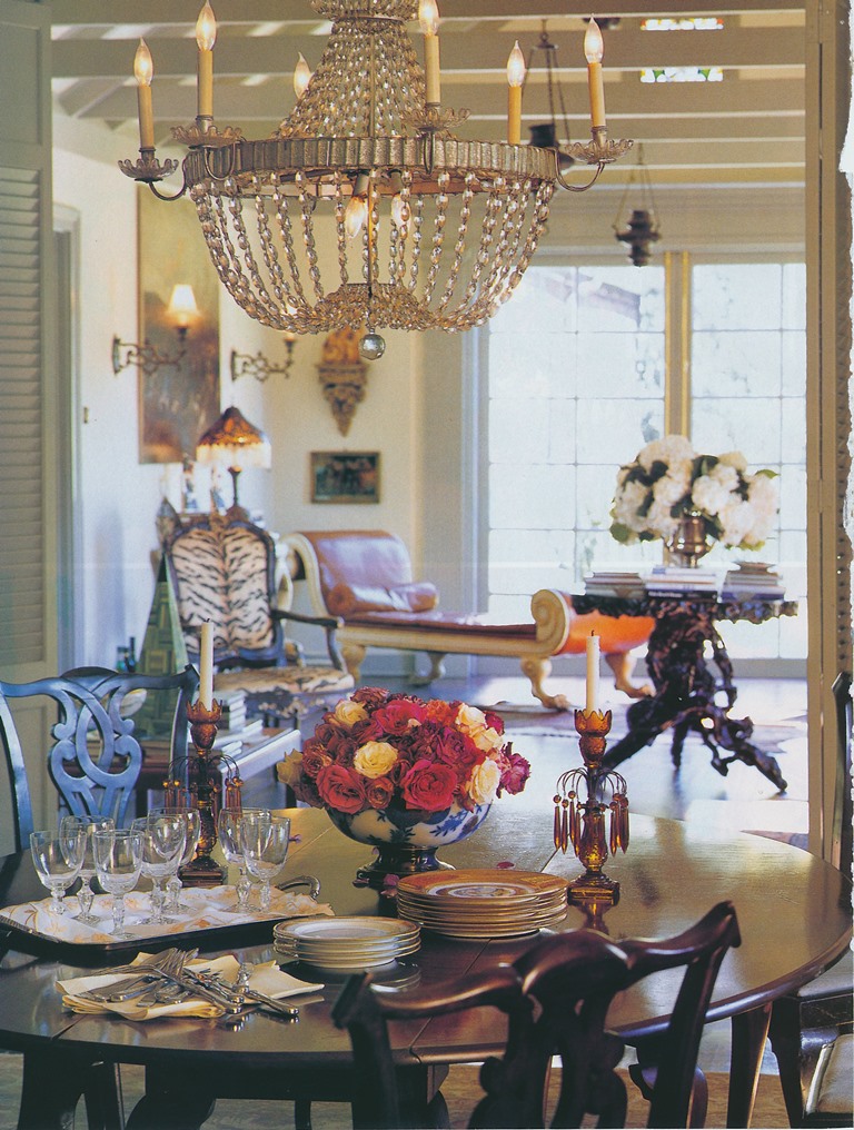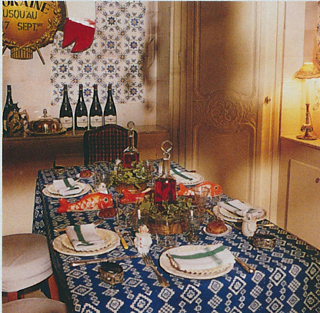 Who better to coax us into preparing a casual weeknight dinner than Marie-Paule Pellé, an "inventive Parisian style maker," according to this Nineties House Beautiful article. It turns out that Pellé, a designer and stylist, was responsible for some of Henri Bendel's interiors when it reopened at 712 Fifth Avenue in the early 1990s. As inventive as Pellé seems to be, she is also an inveterate hostess, able to whip up a delicious meal in half an hour. (If only I could be that efficient when cooking for dinner guests.) For the dinner party seen here, Pellé created a doable menu of store-bought brioches filled with truffle-flavored scrambled eggs, mustard-coated salmon, goat cheese rolled in ground hazelnuts, and poached peaches for dessert.