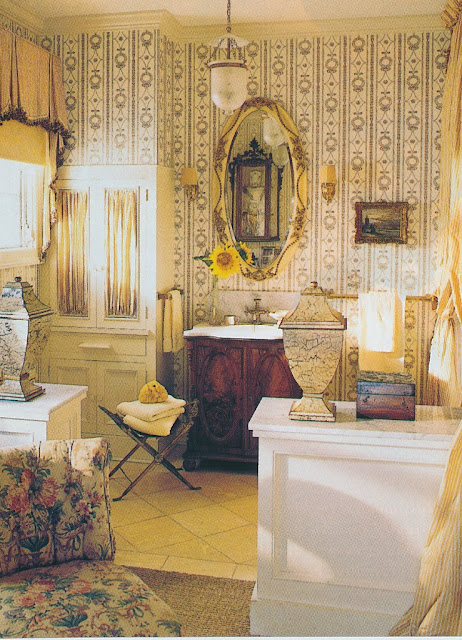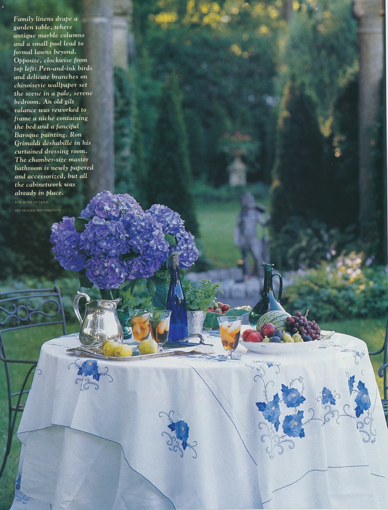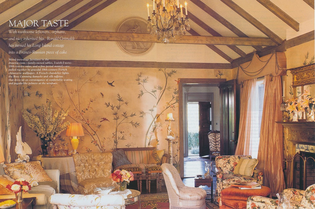 I was reminded of the rewards of meaningful decorating while studying these mid-Nineties photos of the late Ronald Grimaldi's Southampton house. Grimaldi, a designer and one-time president of Rose Cumming, had renovated and sold a number of houses in the area before purchasing this one, which had once served as the "hobby house" on a Stanford White-designed estate. But instead of sinking a lot of time and money into a costly renovation, Grimaldi chose the economical route of refreshing it. A few of the rooms were updated with fresh coats of paint, while others were treated to wallpaper. And other than purchasing a few pieces of furniture for the house, Grimaldi furbished it with pieces he had amassed over time. Nineteenth-century chinoiserie wallpaper, a 1940s-era mirrored table, and Chippendale chairs were just some of the diverse decorations that the designer chose to accompany him to his new home. As unexpected as these furnishings might seem for a coastal house, so, too, are Grimaldi's choice of silk taffetas and damasks, whose inclusion seems only natural considering the designer's association with Rose Cumming. The result is a house that is refreshingly not beach-y nor sporty nor casual but rather comfortably genteel and dignified.