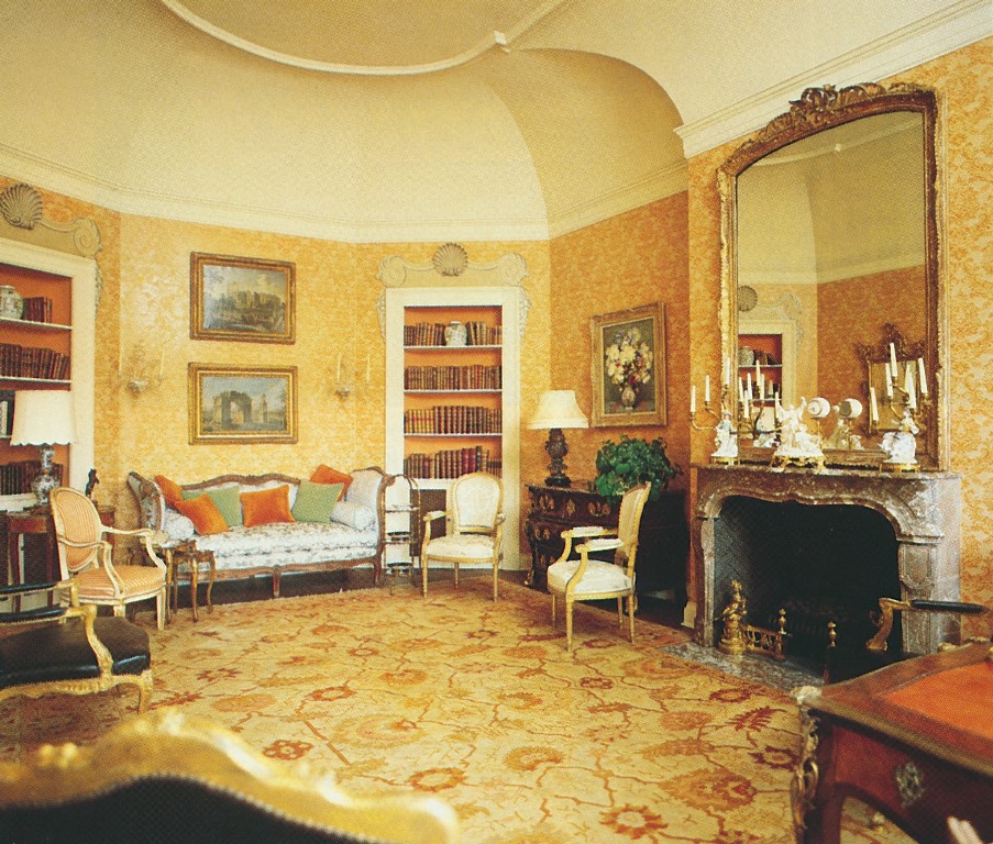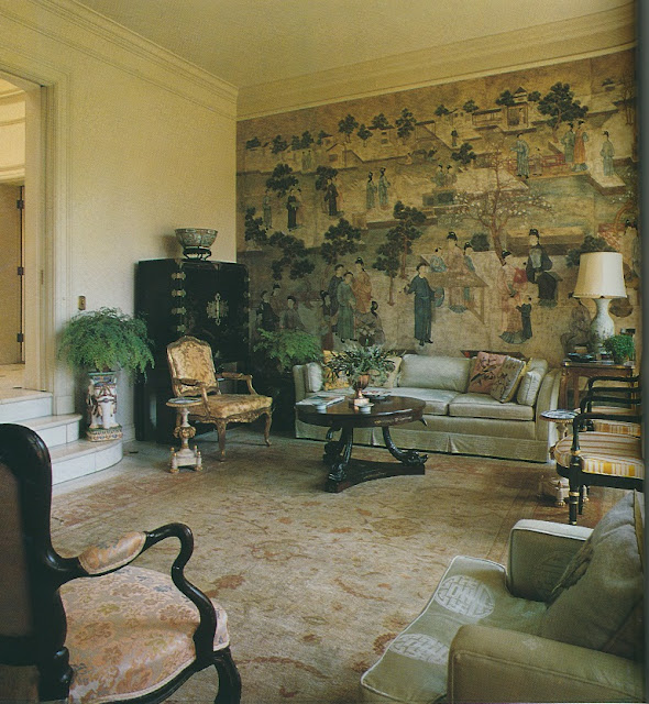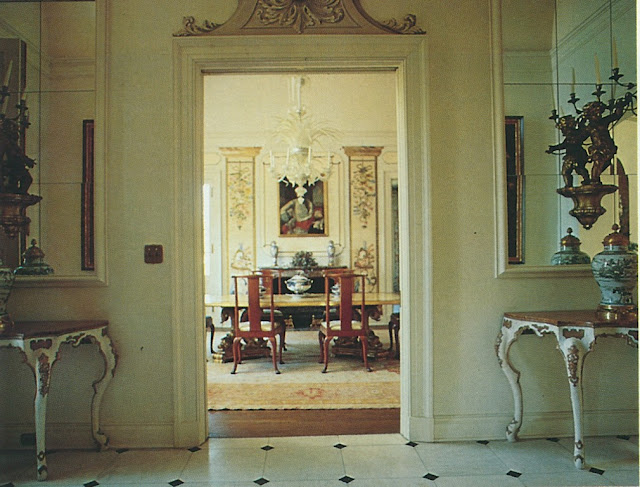 A few things to note while looking at these circa-1979 photos: Above both doors leading to the dining and drawing rooms are trompe l'oeil-painted overdoor moldings. The dining room's Venetian chandelier was made for the house, while hand-painted Chinese wallpaper graces the morning room's walls. And it should be mentioned that decorator David Byers also worked on the home's interiors. I assume that one of his contributions was the set of red-lacquered dining chairs with seats upholstered in a Chinese-medallion silk fabric. Byers sold my parents another set of these chairs covered in the same fabric, although in a robin's egg blue colorway. We still dine in these chairs today.