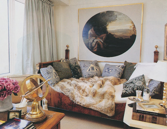 You might remember Hodgins' earlier home, which I featured on my blog a few months ago. That apartment was located in an 1887 building. So, why would a traditionalist like Hodgins choose to live in a modern building? For its conveniences, of course, which included room service provided by the hotel's dining room. Rather than create an old-world backdrop for his "old things," Hodgins wisely chose instead to play up the modern aspects of his apartment, eschewing curtains on some windows, painting walls bright white, and laying faux-concrete tile on the floor. Said Hodgins, "Trying to make a new apartment look old never works." So true. And Hodgins' preferred neutral color-palette meant that his antiques adapted quite nicely to their modern surroundings, making the age discrepancies between possessions and architecture seem minimal.