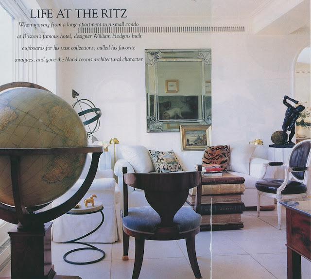 My fixation on having a downstairs restaurant might be why I was so taken with this 1990s House Beautiful article about designer William Hodgins' three-room apartment, which was located in the residential tower at Boston's Ritz-Carlton Hotel. Without a doubt, Hodgins' great taste and beautiful possessions are really the reason why I clipped this article, but the photo of a waiter pushing the room-service dining table into Hodgins' apartment hooked me, too.