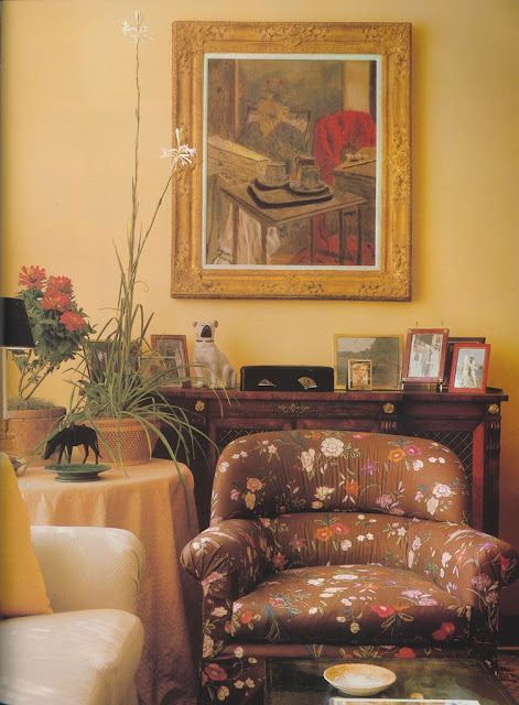 Take, for example, my favorite room in the house, the Braquenié "Le Grand Genois"-shrouded bedroom (fourth photo below). Back in the 1980s, the bed was lavished with lace-edged bed linen, while tables held framed photos, vases, and other small objects. But a decade or so later, the room seemed to have received a thoughtful edit. Some of the room's more extraneous objects were cleared away, while that lacy bed linen was exchanged for bedding made from additional "Le Grand Genois" fabric. While the transformation wasn't radical, it was enough to give the bedroom a slightly more modern appearance.