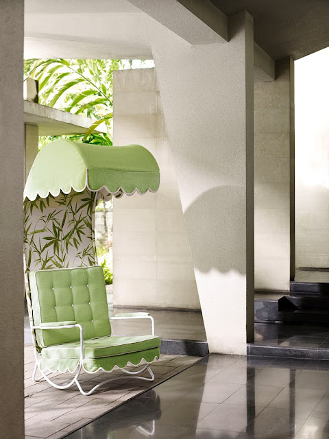 First up are two collections from Jim Thompson: Leo de Janeiro and Negresco, an outdoor fabric collection. Ou Baholyodhin, Jim Thompson's Creative Director for Home Furnishings, conceived Leo de Janeiro as a marriage of Chinese culture ("Leo" representing a Chinese lion) with the exotic, exuberant energy of Carnival in Rio de Janeiro. One of my favorite introductions is Leo de Janeiro, the namesake of the new collection, which features a whimsical Chinese lion that is up to mischief. This particular fabric strikes me as the type that, no matter how long it's in use as curtains or upholstery, you'll continue to cherish it until the fabric is in tatters. Other favorites of mine include Ming Ming (especially the version in black), Heliconia Dreamin', a sumptuously embroidered fabric, and Cala, which is a fresh and colorful update of a traditional silk moire. Equally as tempting is Belize, a bamboo print from the Negresco outdoor collection. It looks like a fabric that might have been used in the home of Betsy Bloomingdale or at Sunnylands, the Annenbergs' Palm Springs estate.
