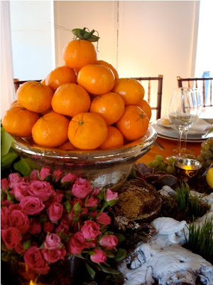 Holding court at either end of the table were blanc-de-chine camels whose backs provided just the place for hammered copper bowls of Daffodils. The other copper bowls on the table held pyramids of clementines and lemons as did mercury glass compotes.