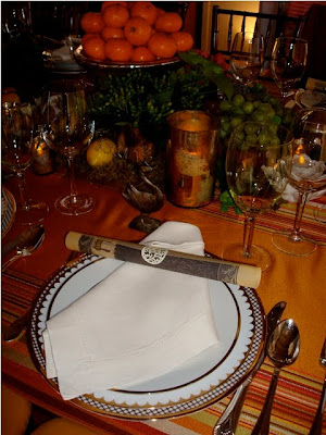 In lieu of place cards, Jonathan chose silvered metal birds, fruits, and Mudras Hands which held each guest's name constructed of wire. The scrolls you see on each plate are vellum prints of engraved illustrations taken from an antique illustrated Haggadah, the book that sets of the order of the Passover Seder. The book is traditionally read throughout the evening's celebration. Each scroll was fastened with laser cut seals.