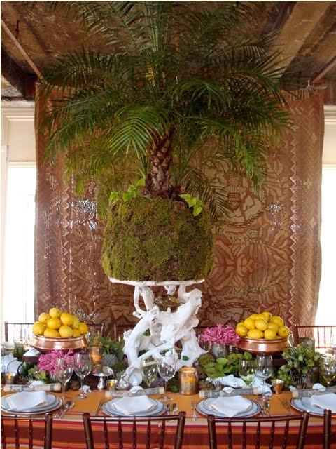 At the center of the table was a large painted driftwood plinth on which Jonathan placed a large date palm, one whose base was covered in chicken wire and sheets of Bull Moss. Jonathan repeated the use of white painted driftwood along the length of the table and incorporated different mosses, spring grasses, flowers, and fruit into the wood. The result, as Jonathan noted, was an above-ground surreal root system. A French Deco 1940's Aubusson rug with stylized pagodas and borders (part of Bunny Williams' extensive antique textile collection) was hung as a backdrop behind the table. This allowed a prep area to be hidden from guests.