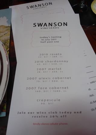 The tasting started with a refreshing 2010 Rosato, followed by a crisp 2010 Chardonnay. Reds followed including Swanson's noted Merlot (2007), a 2007 Alexis Cabernet, and a 2007 Face Cabernet. We ended the tasting with their delicious Crepuscule Late Harvest Semillon. My sister and I were taken with all of the wines tasted. I also have to say that I have never been a Merlot fan, but the Swanson Merlot is one of my new favorite wines. In fact, quite a few bottles of the Merlot, Rosato, and their Pinot Grigio came home with me.