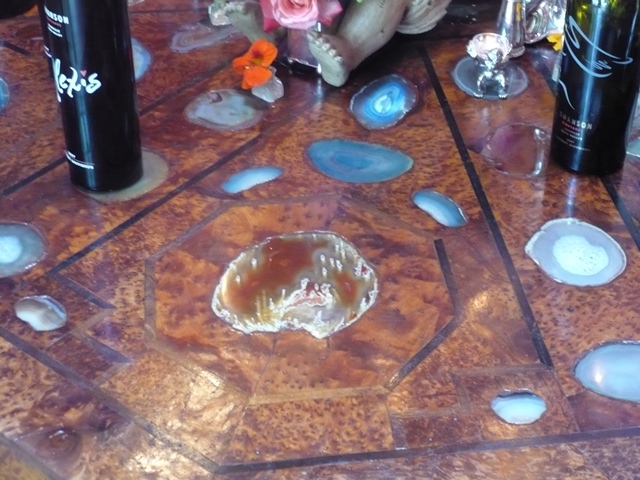 But the heart of the room is the octagonal tasting table with its magnificent polished wood and geode inset top and impressive metal antler base. (Leave it to Britt to find something as unique as this.) The table is graciously set with beautiful silver candelabra, votives, wine glasses and more wine glasses, and flowers arranged to a casual perfection by Alexis' mother, Elizabeth. It's truly a special spot at which to taste the range of Swanson wines.