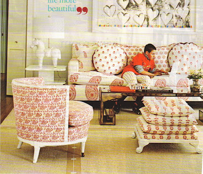 Here's an early Valentine's present: red and white paisley. I'm seeing it everywhere, and it's not hard to understand why. When rendered in red and white, paisley becomes clean, crisp, and graphic. Alessandra Branca has used it in her office (above), and it's the perfect backdrop for black and solid red accessories. And designer Kim Zimmerman used only red and white prints (including a paisley) from Les Indiennes in this Atlanta living room below. Bottom line- it's a great way to add some zip to one's room.