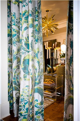 Guess what? This Jim Thompson fabric, used as portières, doesn't even have a name yet- it's that new. Beyond the curtains you can get a glimpse of the study. The chandelier is the Tony Duquette "California Sunburst Chandelier" for Remains Lighting.