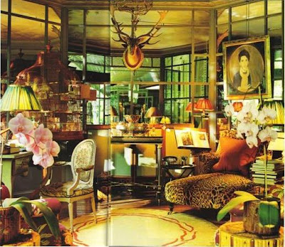 You know the feeling you get when you see a room that speaks to you? A room that perfectly represents the way you want to live? Well, this is how I feel about these garden pavilions at the Parisian home of Pierre Bergé, business partner of Yves Saint Laurent. Designed to accommodate a study and a dining room, each pavilion is a glorious mix of glass and antique mirrored walls, priceless Louis XVI antiques, non-pedigreed pieces, and stylish bibelots. In lesser hands this mélange could come across as a hodge-podge, but here the look is chic, timeless, and comfortable. Now wouldn't having a study like this make work seem much less taxing?