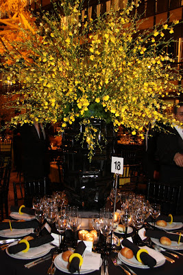 The event kicked off the Ballet's Jerome Robbins Celebration, so naturally the evening's program included such Robbins' works as Circus Polka, The Four Seasons, and of course West Side Story Suite. It was the graphic backdrop of this last piece that inspired the design duo's scheme for the event: yellow and black. I think this was an interesting choice because this color combination is graphic and gutsy and is not usually seen in Moss' residential work. But this is where Moss and Stroud were absolutely correct- when planning an event, sometimes you've got to think big and bold. What might work in a small room at home might fall flat in a large space, especially one like Lincoln Center.