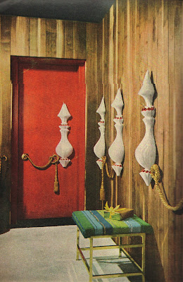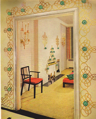 How long has it been since you've seen a Christmas spread in a magazine that did not include greenery of some type? A tree? A garland? A magnolia wreath? Well, this article from House Beautiful (Dec. 1954) was not a paean to things green and natural but rather a tribute to paper decorations. The gold scrollwork pieces and accordion pleated stars and geegaws were all made of paper and were sold on the market under House Beautiful's moniker.