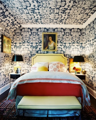 I know what I'll be doing tonight at 9pm (EST, by the way). I'll be logging onto One Kings Lane to shop the Tastemaker Tag Sale of Stone Road Vintage. Not familiar with that name? Well, it's a new venture launched by Tom Dolby and Drew Frist. I'm sure you remember them as well as their fantastic Hamptons house featured in Lonny a while back. And I know that you remember that fabulous bedroom with the Brunschwig & Fils covered walls and ceiling:
