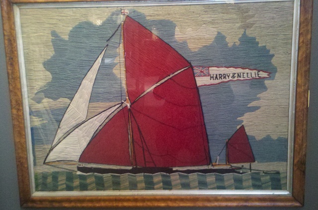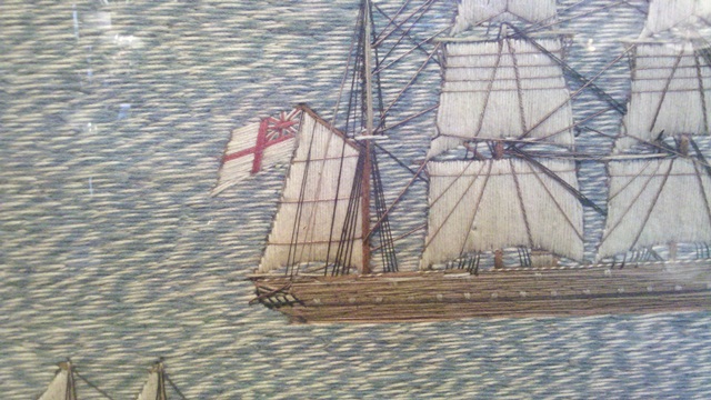 Another specialty of Vandekar is Sailors' Woolworks, needlework that was done by British sailors while at sea. I'm fascinated at how they depicted the water, especially the chevron-print sea in the first example. If you look at the detail shot (the photo immediately above this text), you can see that the stitches were quite long. The examples seen here date to the late 19th century.