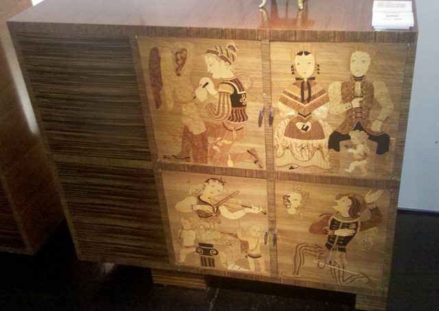 this c. 1935 cabinet by the Hungarian artist, Andrew Szoeke. Trained at the Weiner Werkstatte, Szoeke's pieces "exhibit a unique combination of Mittel European iconography executed in exotic wood inlay and Moderne form."
