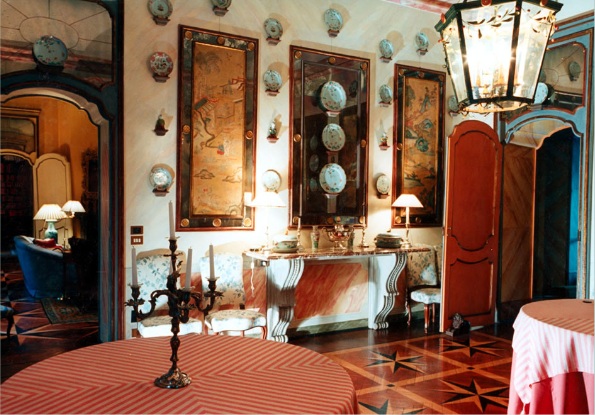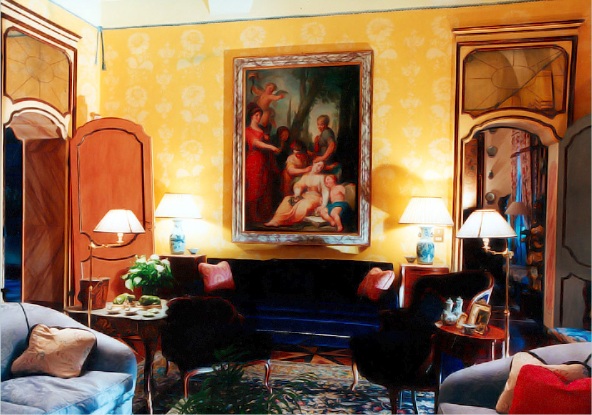 The two photos above show one end of Moschino's double drawing room.