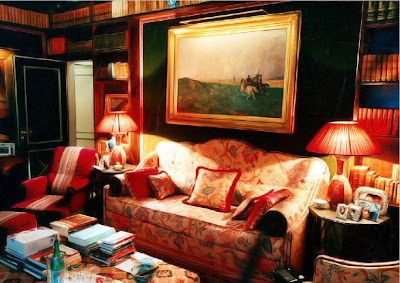But then I got honest with myself. Cool and wow are not only not me, they've become tired and trite. I'm over hip. I want to see pretty interiors. Rooms that look cohesive. Rooms where you don't see one crazy, show-off piece that screams "OMG! Look at me!" After having this conservation with myself, I started to think about designer Paolo Moschino's London home. I first saw photos of it in the October 2004 issue of House & Garden, and two rooms really struck me. First, that dining room. It's such a lovely and elegant room, one that must look so romantic when awash in candlelight. And then there's the rich, rather dramatic looking bedroom with those Chinese Red walls. I couldn't find my tear sheets of the home, so I visited