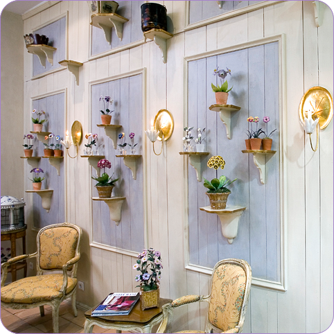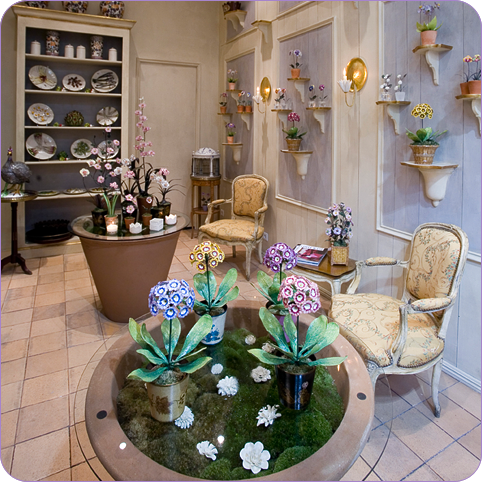 I love the idea of a jewel-box shop that is devoted solely to one type of treasure. (It doesn't get more focused than a store that sells not any old porcelain, but porcelain vegetables and flowers!) In fact, my idea of heaven is a small cobblestone alley filled with shops selling embroidered linen, porcelain, stationery, antique books, scents for the home, antique copper cookware, and antique silver- all on a bijou scale, of course. Le Cabinet de Porcelaine would fit into this dream shopping mecca perfectly.