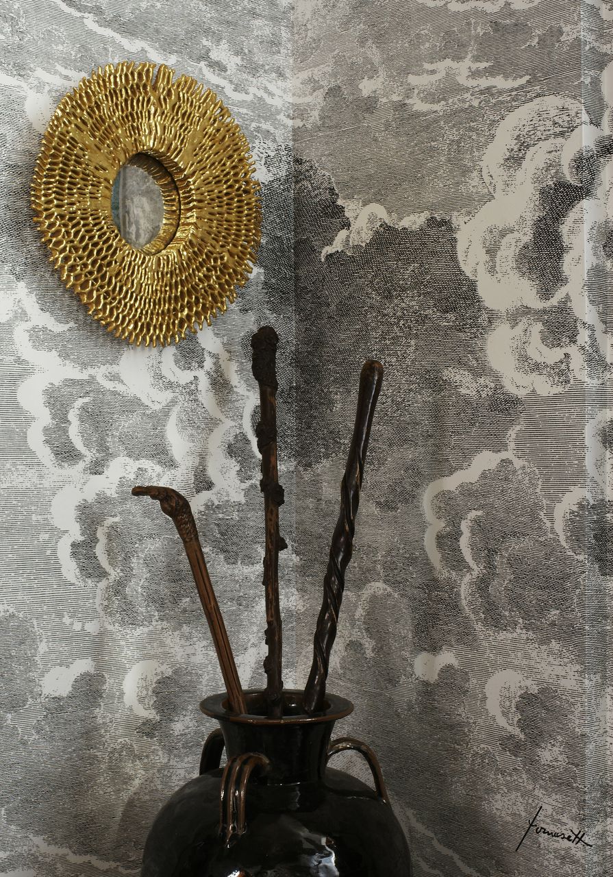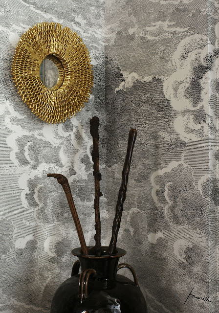 The entry foyer as designed by Lichten Craig. The paper is a Fornasetti design.