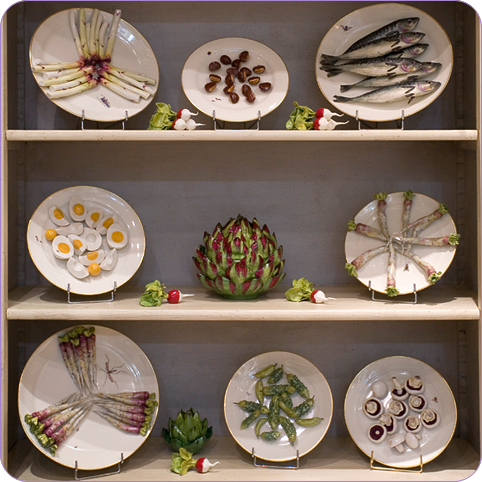 My weekend internet fishing expedition turned up what has to be my new favorite shop...although sadly, I have yet to visit it. Le Cabinet de Porcelaine, located at 37 rue de Verneuil in Paris, deals exclusively in the porcelain work of Didier Gardillou and Samuel Mazy. You might be familiar with Gardillou's charming porcelain fruits, vegetables, and flowers, which have been sold in the past at Charlotte Moss' Townhouse, Sue Fisher King, and Branca. Unfortunately, I do not own any pieces by Gardillou, but my sister has one of his small lettuce boxes, which is très magnifique.