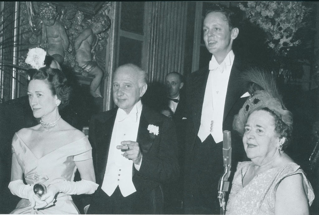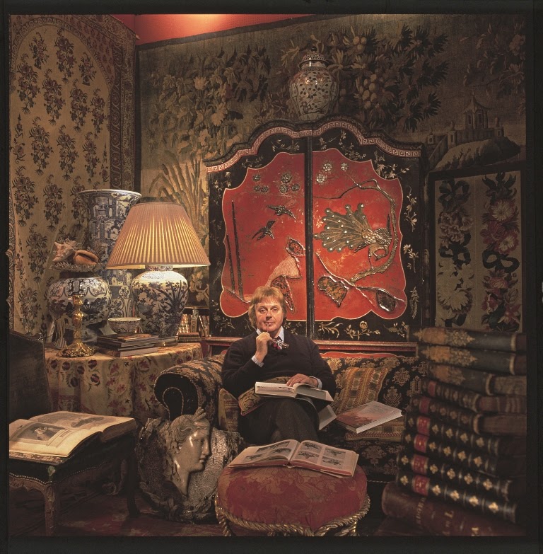 One of Bennison's most high-profile projects was for publisher Lord Weidenfeld. In this photograph, Weidenfeld can be seen in his Bennison-decorated Riverside apartment in Chelsea.